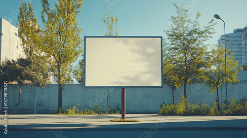 Large blank billboard in modern city skyline, placed among tall skyscrapers and blue sky, ideal for urban advertising, marketing campaigns and commercial announcements. Banner with copy space.mock up,
