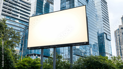 Large Blank White Billboard Display In A Modern City Center With Skyscrapers And Lush Green Trees During Daytime