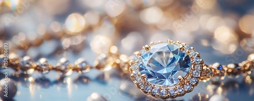 Large blue gemstone shining on gold necklace on reflective surface