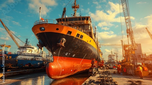 Large cargo ship docked at a bustling harbor, showcasing industrial activity with cranes, colorful skies, and a vibrant maritime environment during sunset