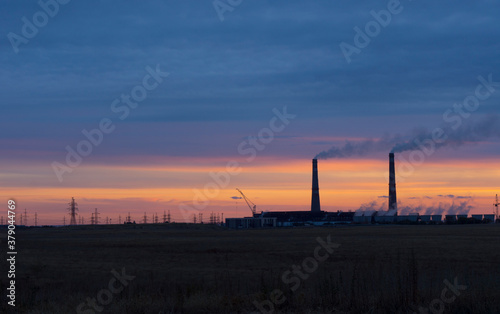 Large chimneys of an industrial plant emit smoke into the atmosphere. Ecology problem, environmental pollution. Heat station.