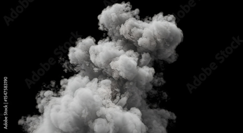 Large cloud of white smoke or vapor billows upward on a black background. Abstract gas or dust explosion for special effects.