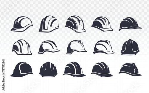 Large collection of construction hard hat silhouettes shown from multiple angles. Monochrome safety icons ideal for engineering firms, contractors, workplace protection campaigns, and construction