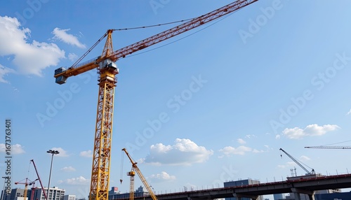 Large Construction Crane Against Clear Blue Sky Over Urban Landscape with Clouds and Building Structures