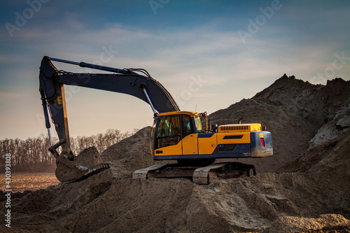 Large construction excavator yellow on a construction site in a quarry for quarrying. Yellow excavator on a construction site against blue sky.