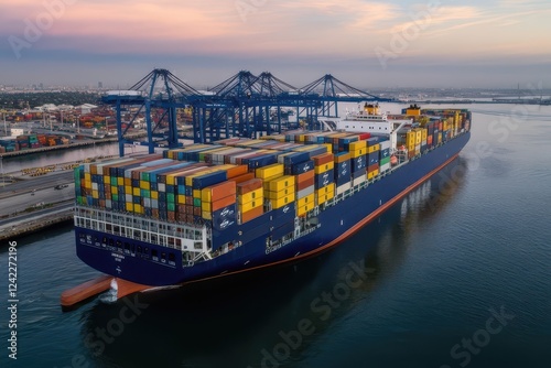 Large Container Ship Loaded with Colorful Cargo at Port Harbor During Dawn Glow
