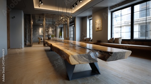 Large contemporary dining room features a unique wooden table with modern design elements and elegant lighting