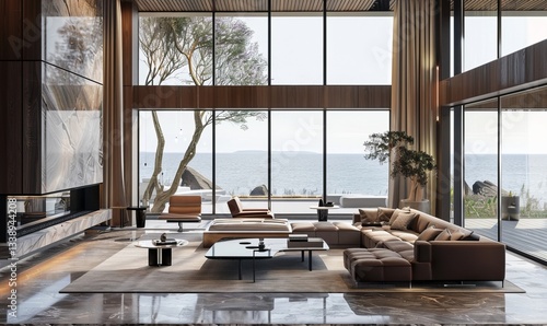 Large contemporary living room with modern furniture, large windows, and minimalist decor, 4K hyperrealistic photo