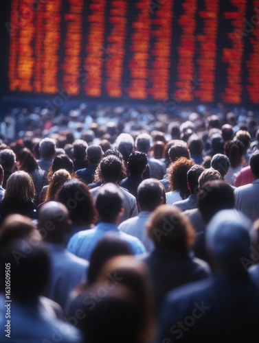 Large Crowd Gathered in a Bustling Financial District Observing Stock Market Display During Peak Trading Hours