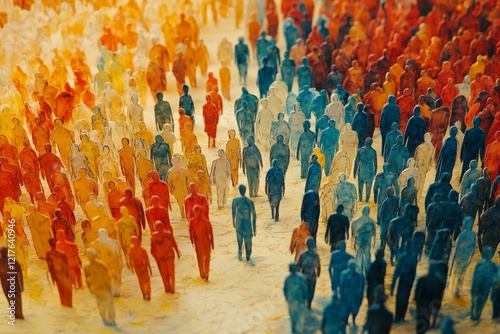Large crowd of colorful figures walking together in a vibrant artistic representation