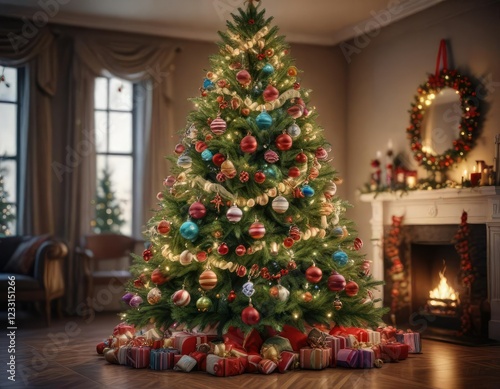 Large decorated christmas tree with colorful ornaments and garlands, , seasonal decoration, garlands