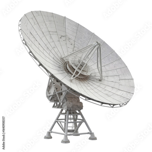 Large, dish-shaped radio telescope, white metal, isolated on black