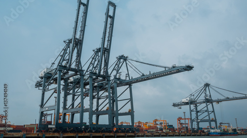 Large dockside gantry steel crane lifting a containers at the port of Laem Chabang in Chonburi Province, Thailand in vintage style image.