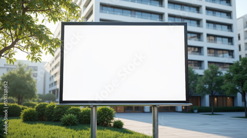 Large empty billboard mockup in a landscaped courtyard surrounded by modern apartment buildings and lush green trees on a sunny day.