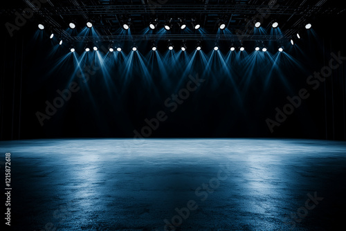 large empty stage illuminated by multiple spotlights, creating dramatic atmosphere. polished floor reflects light, enhancing stage depth and potential for performances