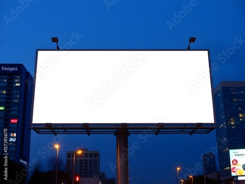 Large Empty White Billboard Display Standing Above Urban Street With Modern Buildings. A blank white billboard with lighting fixtures mounted on poles towers over a busy city street surrounded by.