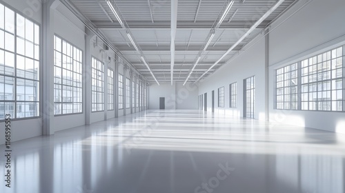 Large empty white industrial warehouse interior with natural light.