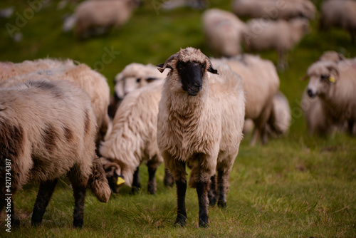 large flock of sheep walking on the rocky mountain at high altitude