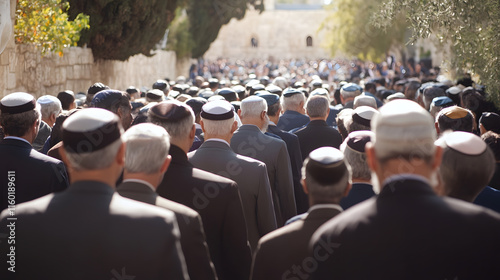 Large Gathering of People with Traditional Head Coverings Attending an Outdoor Ceremony in Historical Setting : Generative AI