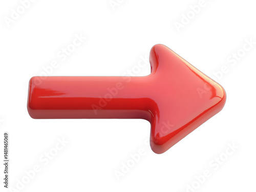Large, glossy, hyperrealistic 3D red arrow pointing right, isolated on transparent background. Perfect for indicating direction, next steps, progress, or guiding viewers in digital design.