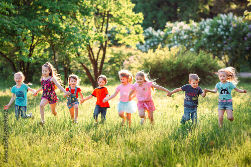 Large group of kids, friends boys and girls running in the park on sunny summer day in casual clothes .