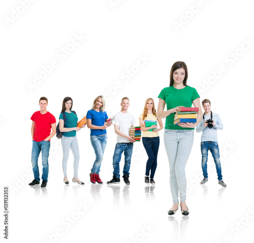 Large group of teenage students isolated on white background. Many different people standing together. School, education, college, university concept.