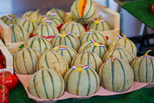 Large heap of fresh ripe organic melons on farmer market in Paris