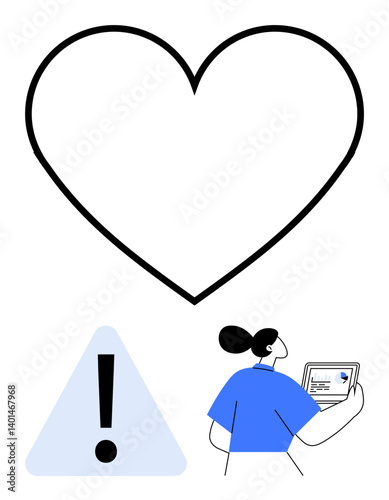 Large heart outline with caution icon and woman analyzing health data on a tablet. Ideal for wellness, prevention, health monitoring, healthcare technology, medical caution, self-care, flat simple