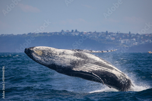 Large humpback whale breaches with the shore in the background off Sydney, New South Wales, Australia
