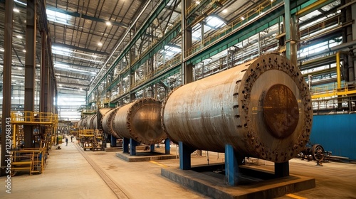 Large industrial tanks holding molten metal in a steel plant