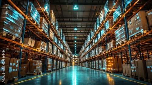 Large Industrial Warehouse Interior With Pallets And Boxes