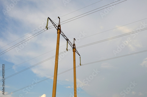 large iron concrete pillars and power lines against the background of the sky during sunset