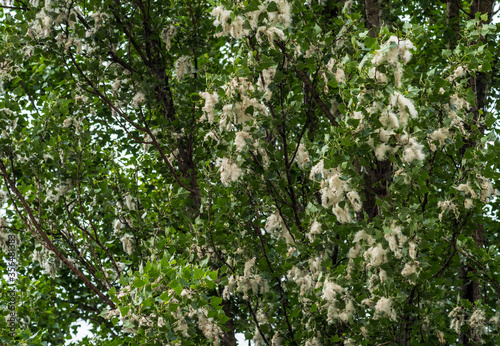 Large lumps of fluff on a female poplar tree. Selective focus.