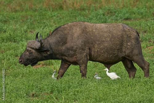 Large male African Buffalo (Syncerus caffer) grazing on fresh grass during the emerald season in South Luangwa National Park, Zambia