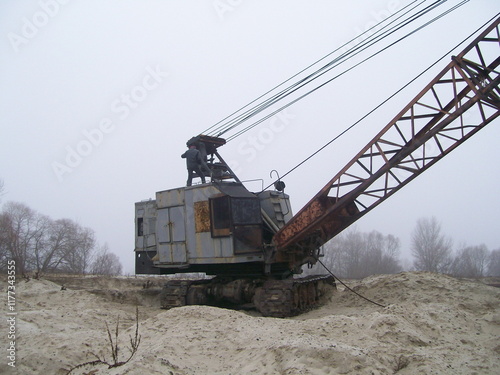 Large metal excavator on tracks. Career. Sand mining. Bad weather.