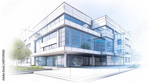 Large modern hospital building, pencil sketch and blueprint .