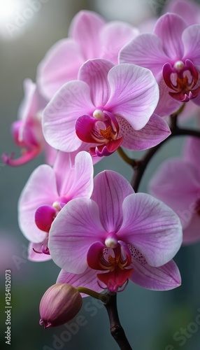 Large orchid flowers on a branch in bloom. Blossom of delicate petals, colors in shades of pink. Fresh floral botany illustration with vibrant spring bloom.