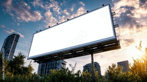 Large outdoor blank advertising billboard on city skyline with tall buildings and sunset sky background