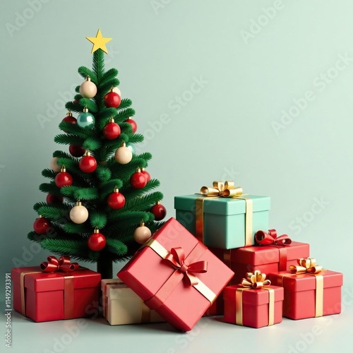Large pile of gift boxes in front of a small Christmas tree, presents, Christmas decorations