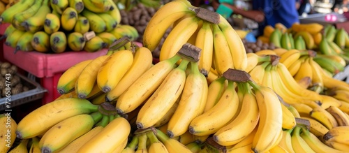 Large quantity of ripe yellow bananas and various tropical fruits available at the turkey farmers market.