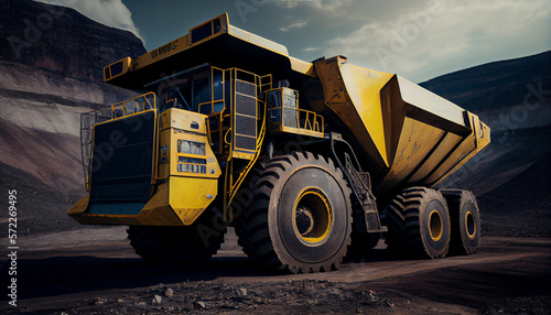 Large quarry dump truck in coal mine. Mining equipment for the transportation of minerals.