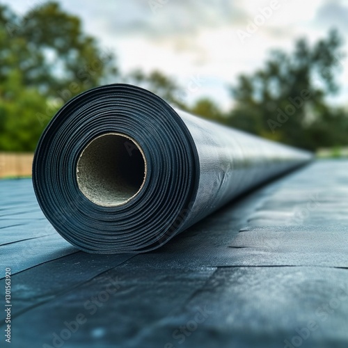 Large roll of black roofing material on construction site with trees in background
