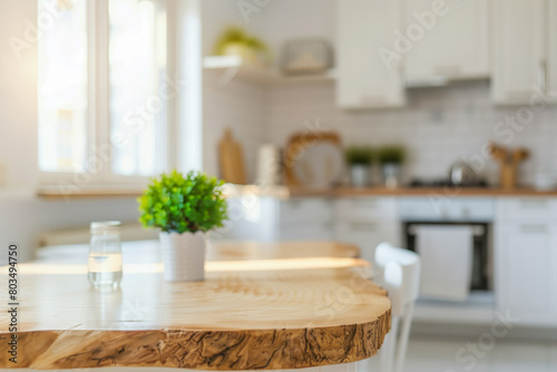 Large rustic dining table made of wooden slab in modern kitchen room, minimal interior design background, extra wide