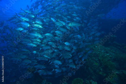 large school of Jacks schooling, World War II Cargo Shipwreck-Liberty,Tulamben, Bali, Indonesia
