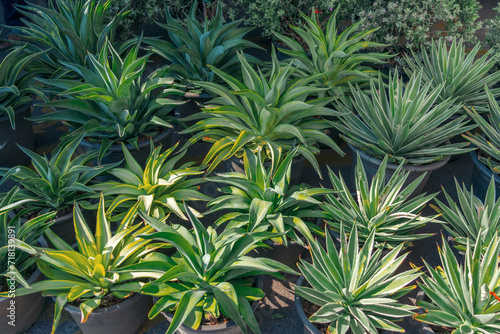 Large seedlings row blue agave plant grown for sale in pots outdoors at a garden center plantation.