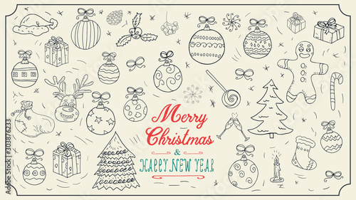 large set Christmas new year contour sketches icons for design decoration holiday illustration style childrens Doodle toys gifts balls snowflakes background isolated