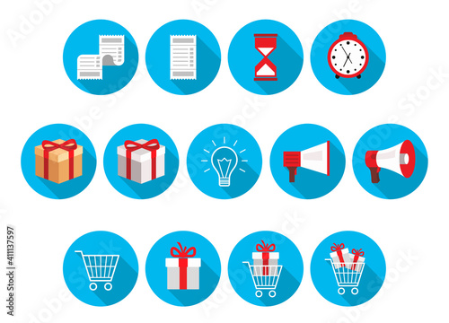 Large set of 2D and 3D icons in a circle, promotion, discount, gift, bonus, shop. Box in a shopping basket, shopping trolley, clock, hourglass, check-02