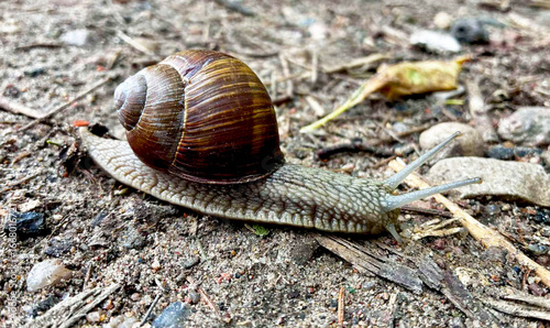 Large snail close-up. Bright Brown large snail. Slowly crawling slug