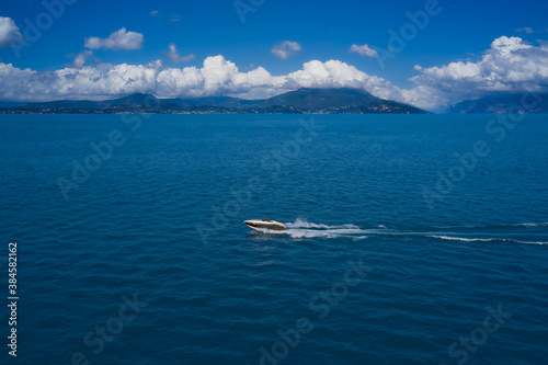 Large speedboat moving at high speed in the background of the coastline mountains and cumulus clouds. Large speed boat moving at high speed side view. Travel - image. Aerial view luxury motor boat.