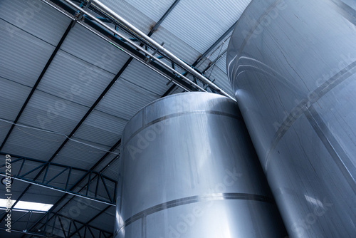 Large stainless steel industrial tanks in a modern production facility, used for wine or beverage storage. The clean metal surfaces and industrial design highlight a high-capacity storage solution